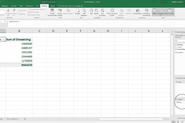 Under ”Pivottabelfelter” tager du så ”Afdeling” og hiver ned til ”Rækker”. Herefter tager du ”Omsætning” og hiver ned i ”Værdier”.