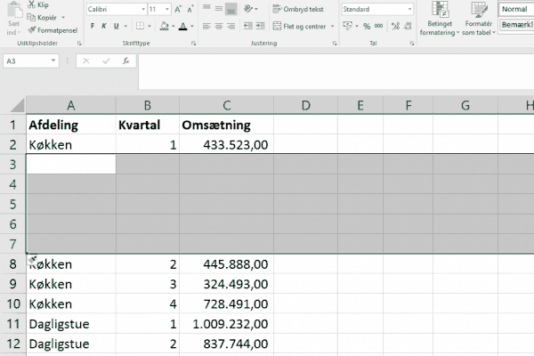 Efterhånden som du bliver mere kompetent i at lege rundt med data i Excel, så kommer du helt sikkert til at tilføje flere rækker og kolonner løbende. Som standard, indsætter Excel kun 1 kolonne/række. Dét er jo ikke super hensigtsmæssigt, hvis du nu gerne vil have 5 nye rækker indsat.