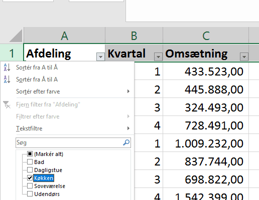 Nu får samtlige overskrifter i række 1 en lille dropdown-menu. Klik her på dropdown-pilen ved ”Afdeling”. Fjern flueben i samtlige valgmuligheder, på nær ”Køkken”. Klik ”Ok” og nu får du kun vist information vedrørende afdelingen ”Køkken”.
