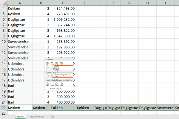 Næste gang du står overfor lignende udfordring, så har Excel et smart værktøj til at vende din data. Dette værktøj kaldes ”Transponer”.